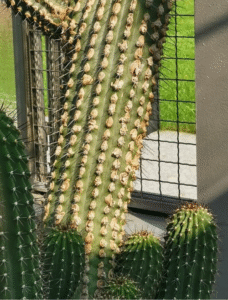 Small Cephalocereus polylophus cactus with green stems and white spines in Rome, Italy.
