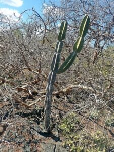 Cereus saddianus cactus met lange groene stengels en witte bloemen.