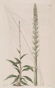 Gastrodia elata plant met witte bloemen en groene bladeren op kleigrond.