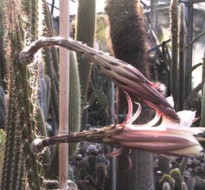Zeldzame Harrisia bonplandii cactus met witte bloemen op groene stengels.
