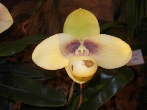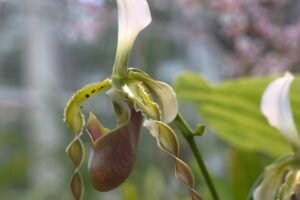 Prachtige Paphiopedilum emersonii orchidee met unieke bloemen en groen blad. Perfect voor liefhebbers van zeldzame planten. Voeg deze schoonheid toe aan je collectie!
