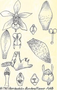 Pomatocalpa orchidee met witte bloemen en groene bladeren op neutrale achtergrond.