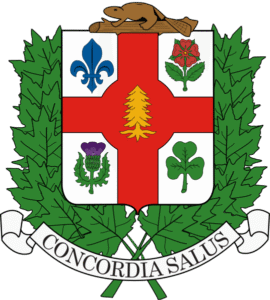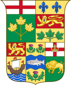 Historisch wapenschild van Grenada met leeuw, schip, kroon in goud en groen.